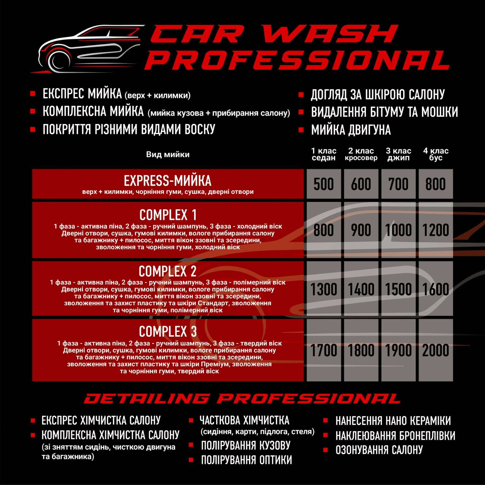 | Експрес миття (кузов+килимки) | 250 | 250 | 300 | 350 | ЗАПИСАТИСЬ |